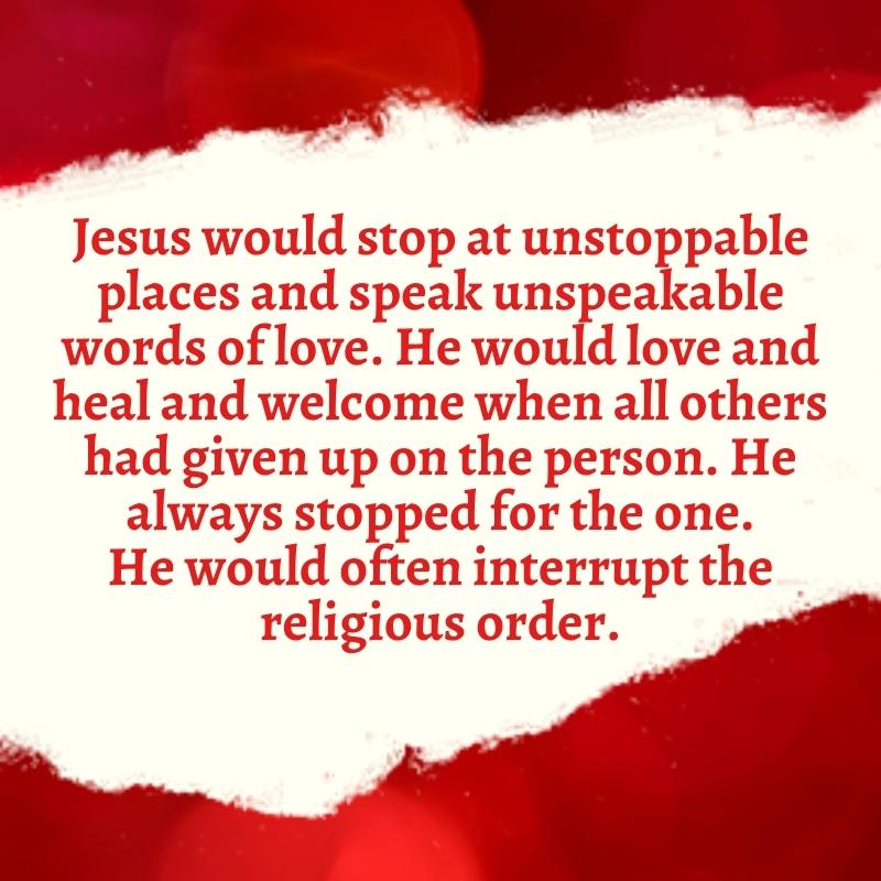 When Jesus was walking on earth, there was something that would happen very often. It was the fact that He would be an unexpected interrupter. He would interrupt the cycle of rejection and judgement sinners would receive by loving them. He would disrupt people by loving them. He would stop at unstoppable places and speak unspeakable words of love. He would love and heal and welcome when all others had given up on the person. He always stopped for the one.