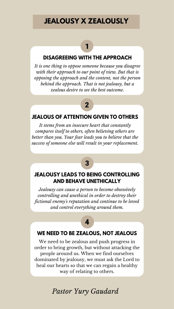 There is a significant distinction between being Jealous and being Zealous. Both come from a heart that cares, but one is concerned with their own well-being and the other with the growth of the group. One is insecure and attacks others, while the other is self-assured and questions the approach. In the end, only the one will keep their relationships healthy. Look at this post!