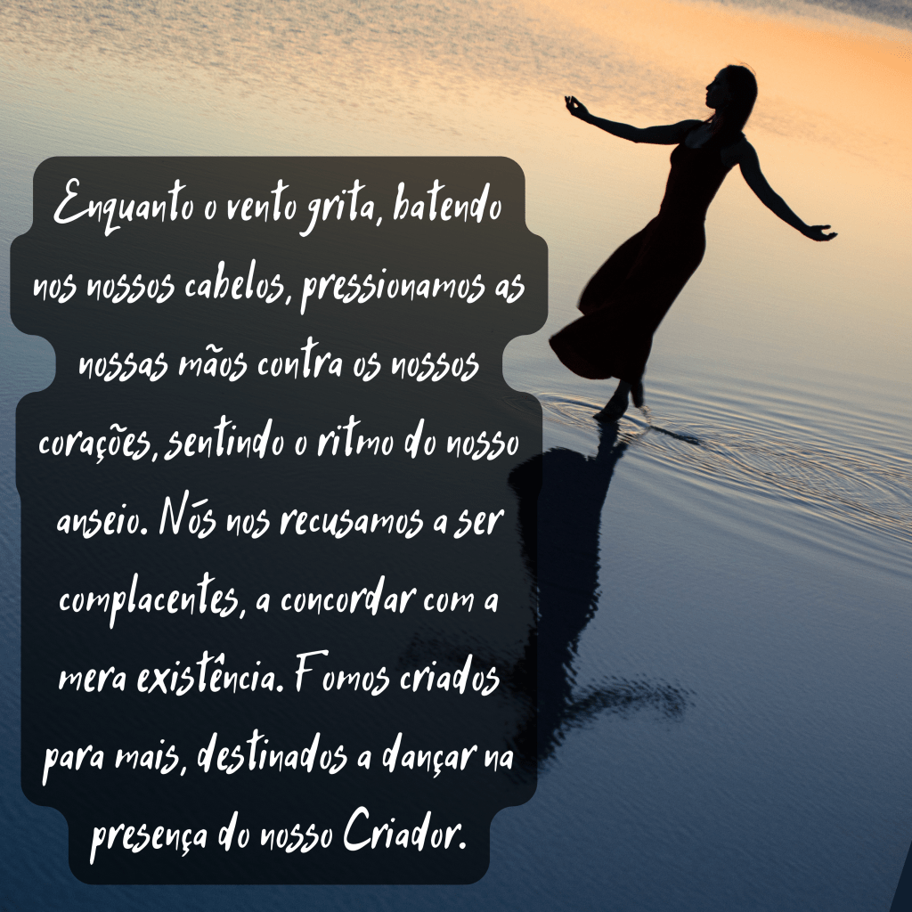 Enquanto o vento grita, batendo nos nossos cabelos, pressionamos as nossas mãos contra os nossos corações, sentindo o ritmo do nosso anseio. Nós nos recusamos a ser complacentes, a concordar com a mera existência. Fomos criados para mais, destinados a dançar na presença do nosso Criador.