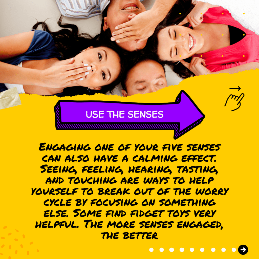 Engaging one of your five senses can also have a calming effect. Seeing, feeling, hearing, tasting, and touching are ways to help yourself to break out of the worry cycle by focusing on something else. Some find fidget toys very helpful. The more senses engaged, the better.