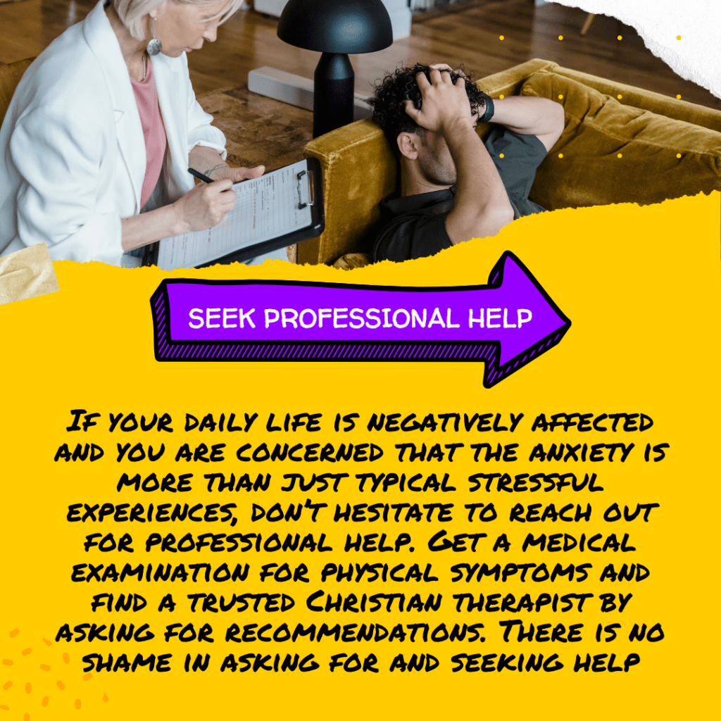 If your daily life is negatively affected and you are concerned that the anxiety is more than just typical stressful experiences, don’t hesitate to reach out for professional help. Get a medical examination for physical symptoms and find a trusted Christian therapist by asking for recommendations. There is no shame in asking for and seeking help.