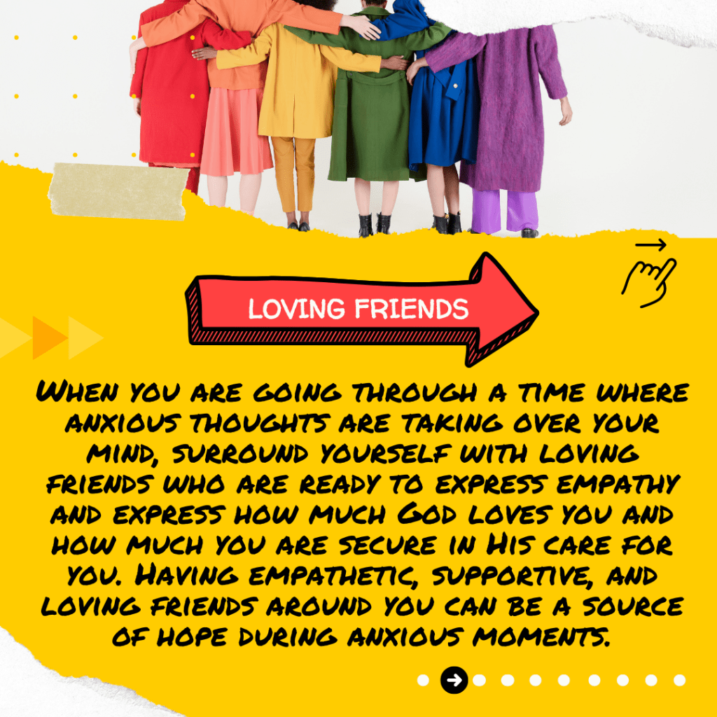 When you are going through a time where anxious thoughts are taking over your mind, surround yourself with loving friends who are ready to express empathy and express how much God loves you and how much you are secure in His care for you. Having empathetic, supportive, and loving friends around you can be a source of hope during anxious moments.