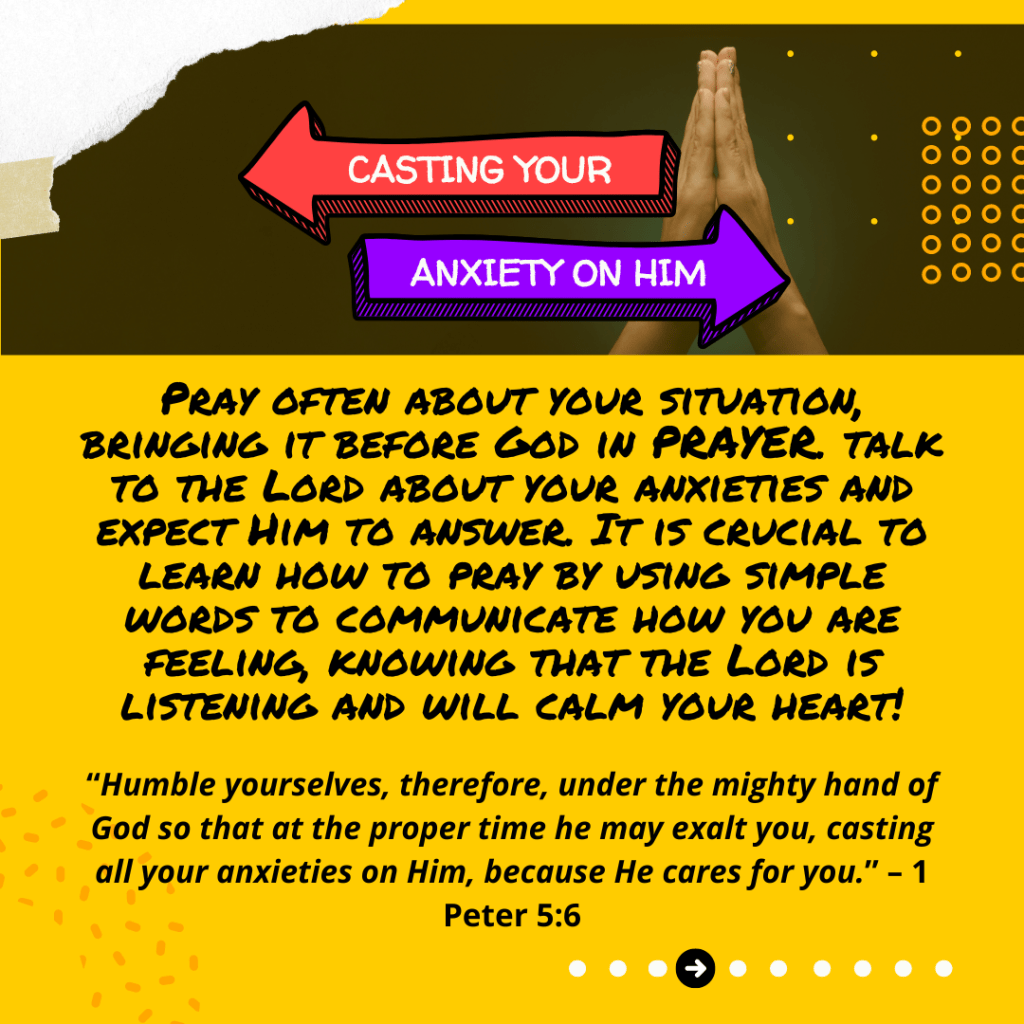 Pray often about your situation, bringing it before God in PRAYER. Talk to the Lord about your anxieties and expect Him to answer. It is crucial to learn how to pray by using simple words to communicate how you are feeling, knowing that the Lord is listening and will calm your heart!