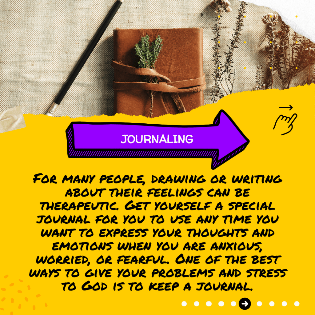 For many people, drawing or writing about their feelings can be therapeutic. Get yourself a special journal for you to use any time you want to express your thoughts and emotions when you are anxious, worried, or fearful. One of the best ways to give your problems and stress to God is to keep a journal.