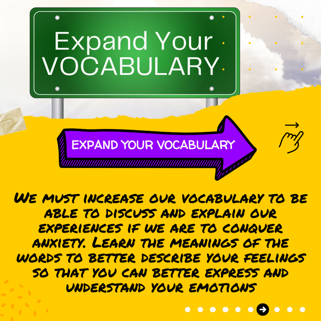 We must increase our vocabulary to be able to discuss and explain our experiences if we are to conquer anxiety. Learn the meanings of the words to better describe your feelings so that you can better express and understand your emotions.