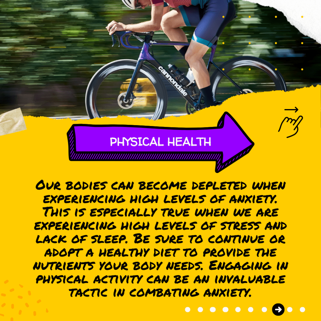 Our bodies can become depleted when experiencing high levels of anxiety. This is especially true when we are experiencing high levels of stress and lack of sleep. Be sure to continue or adopt a healthy diet to provide the nutrients your body needs. Engaging in physical activity can be an invaluable tactic in combating anxiety.