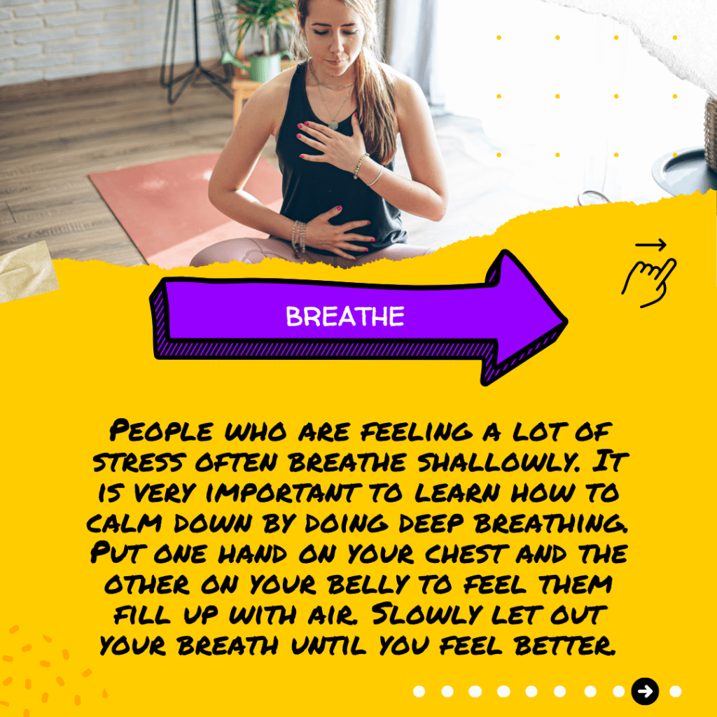 People who are feeling a lot of stress often breathe shallowly. It is very important to learn how to calm down by doing deep breathing. Put one hand on your chest and the other on your belly to feel them fill up with air. Slowly let out your breath until you feel better.